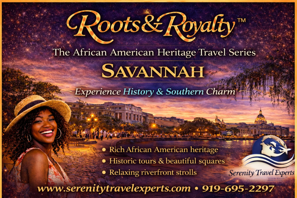 Step into a city where history, heritage, and Southern elegance come together in the most beautiful way. Join Serenity Travel Experts for an unforgettable 3 Night, 4 day journey to Savannah, Georgia, curated as part of our signature Roots & Royalty Series—a collection of culturally rich experiences designed to honor our stories, celebrate our legacy, and create meaningful connections through travel.